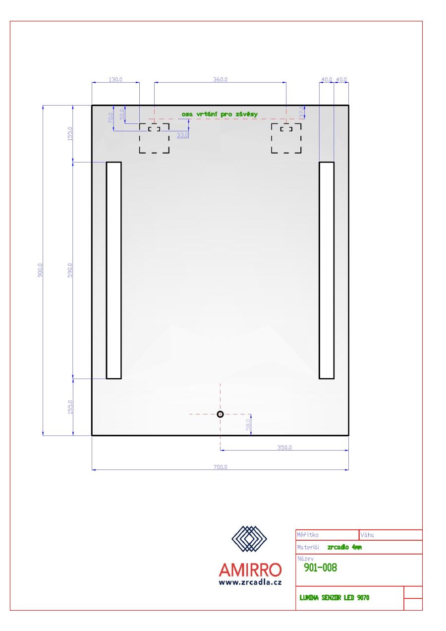 Montáž: Zrcadlo je vybaveno úchyty (závěsy i vhodné háky na zeď) pro svislé zavěšení. U zrcadel s osvětlením doporučujeme vývod elektřiny umístit „na střed zrcadla“. Celková tloušťka zrcadla včetně podsvícení je cca 4 cm.