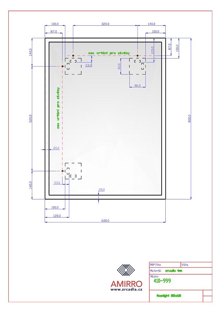 Montáž: U zrcadel s osvětlením doporučujeme vývod elektřiny umístit „na střed zrcadla“.