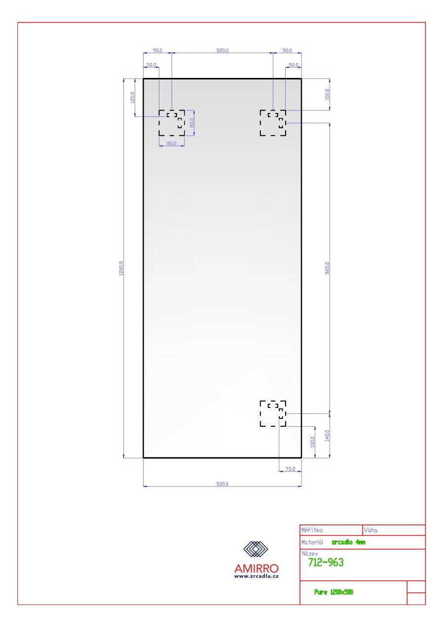 Rozměry: 50 a 120 cm. Lze pověsit na šířku i na výšku. Zrcadla PURE je kvalitní 5 mm silné zrcadlo, na kterém díky této síle lépe vynikne jeho lesklá hrana (leštěná pod úhlem 45°, 1 mm široké zkosení). Zrcadlo dodáváme včetně závěsů.