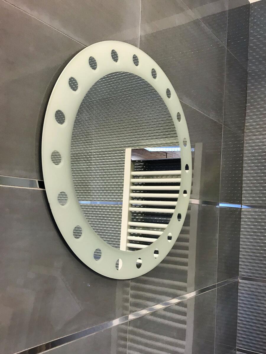 Rozměr: průměr 600 mm. Zrcadla s potiskem imitujícím pískovaný motiv po obvodu zrcadla. Zrcadlo o síle 4 mm dodáváme včetně 2 závěsů k pověšení.