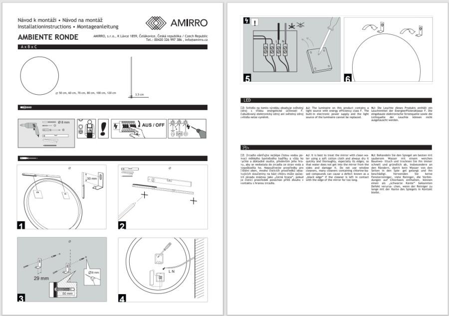 Montáž: U zrcadel s osvětlením doporučujeme vývod elektřiny umístit „na střed zrcadla“.