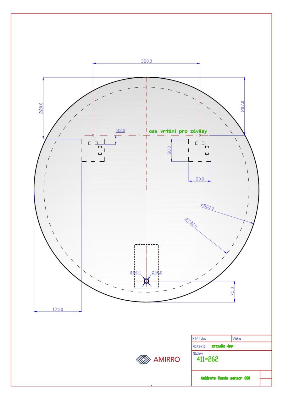 Montáž: Zrcadlo je vybaveno závěsy i vhodnými háky na zeď. U zrcadel s osvětlením doporučujeme vývod elektřiny umístit „na střed zrcadla“.