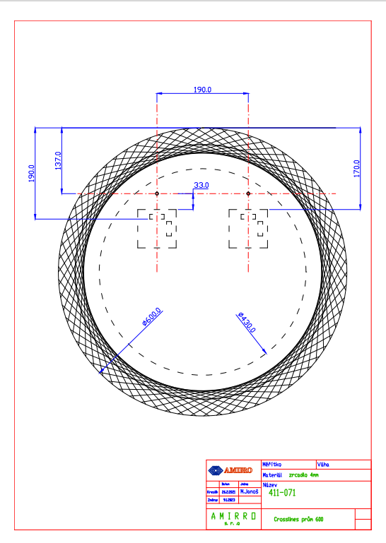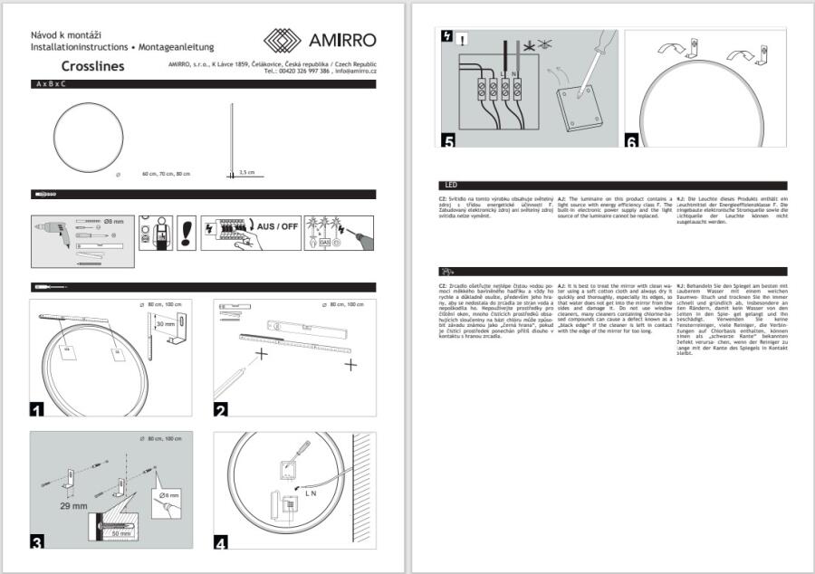 Rozměr: průměr 60 cm. Zrcadlo Crosslines je navíc příjemně podsvícené úsporným LED osvětlením, ve kterém vynikne jeho efektně zdobený okraj s motivem zkřížených linií, od něhož je odvozený název zrcadla. Samozřejmostí je, že zrcadlo splňuje stupeň krytí IP44. Barevná teplota LED je 4000 °K (neutrální) a spotřeba el. energie je 14W, 1820 lm. Zrcadlo je vybaveno závěsy a příslušnými montážními prvky na zeď a je v provedení bez vypínače - rozsvěcí se tedy přímo k tomu určeným vypínačem na zdi. Montáž: U zrcadel s osvětlením doporučujeme vývod elektřiny umístit „na střed zrcadla“.