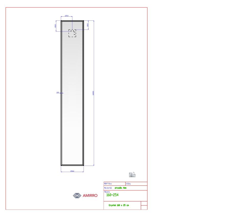 Rozměry: 25 a 160 cm. Lze pověsit na šířku i na výšku. Jednoduchá zrcadla s fazetou 10 mm. Síla zrcadla je 4 mm a je vybaveno 3 ks závěsy. Fazeta – obroušením a vyleštěním okraje zrcadla šikmo pod úhlem 4 – 20° v šířce 5 - 30 mm se vytvoří změnou úhlu odrazu optický efekt rámečku.