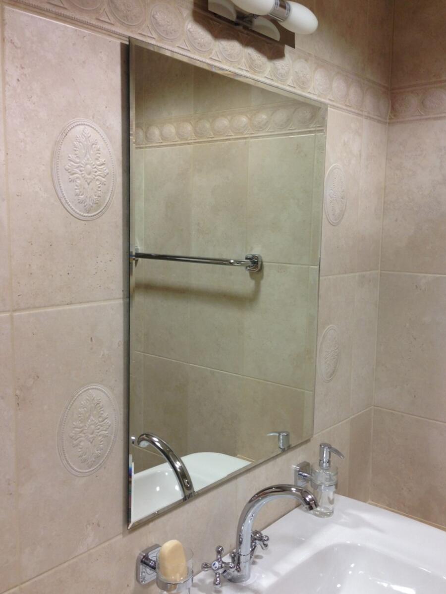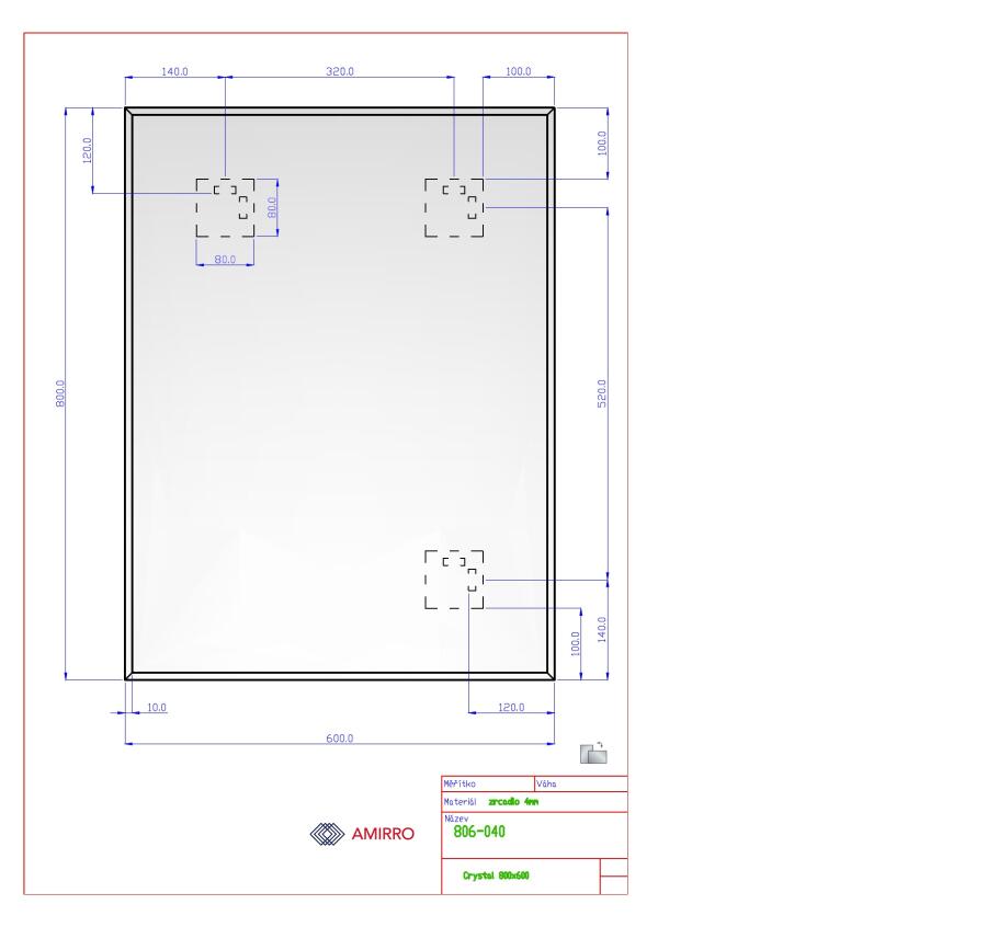 Rozměry: 60 a 80 cm. Lze pověsit na šířku i na výšku. Jednoduchá zrcadla s fazetou 10 mm. Síla zrcadla je 4 mm a je vybaveno 3 ks závěsy. Fazeta – obroušením a vyleštěním okraje zrcadla šikmo pod úhlem 4 – 20° v šířce 5 - 30 mm se vytvoří změnou úhlu odrazu optický efekt rámečku.