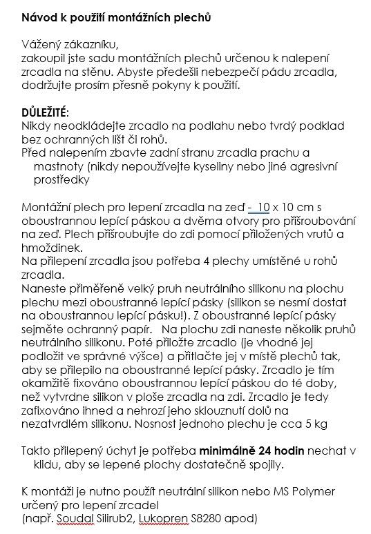 Sada plechů pro lepení zrcadla na zeď - sada obsahuje 4 x kovový plech 10 x 10 cm s oboustrannou lepící páskou se dvěma otvory, 8 x hmoždinka a 8 x vrut k upevnění plechů do zdi. Na přilepení zrcadla jsou potřeba 4 plechy umístěné u rohů zrcadla v kombinaci s použitím neutrálního silikonu nebo MS Polymeru určeného pro lepení zrcadel, které nejsou součástí této sady - neutrální silikon můžete dokoupit na tomto eshopu v sekci Montážní materiál. Zrcadlo je prostřednictvím těchto plechů s oboustrannou lepící páskou okamžitě fixováno do té doby, než vytvrdne silikon v ploše zrcadla na zdi. Nehrozí tedy jeho sklouznutí dolů na nezatvrdlém silikonu. Při montáži postupujte dle přiloženého návodu. Nosnost jednoho plechu je cca 5 kg.