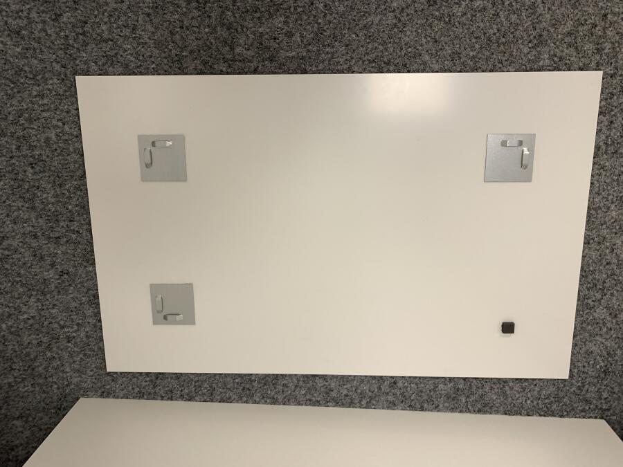 Rozměry: 88 a 55 cm. Lze pověsit na šířku i na výšku. Tabule z bílého skla lacobel vhodná pro psaní poznámek a vzkazů. Je vybavena závěsy a montážními prvky do zdi.