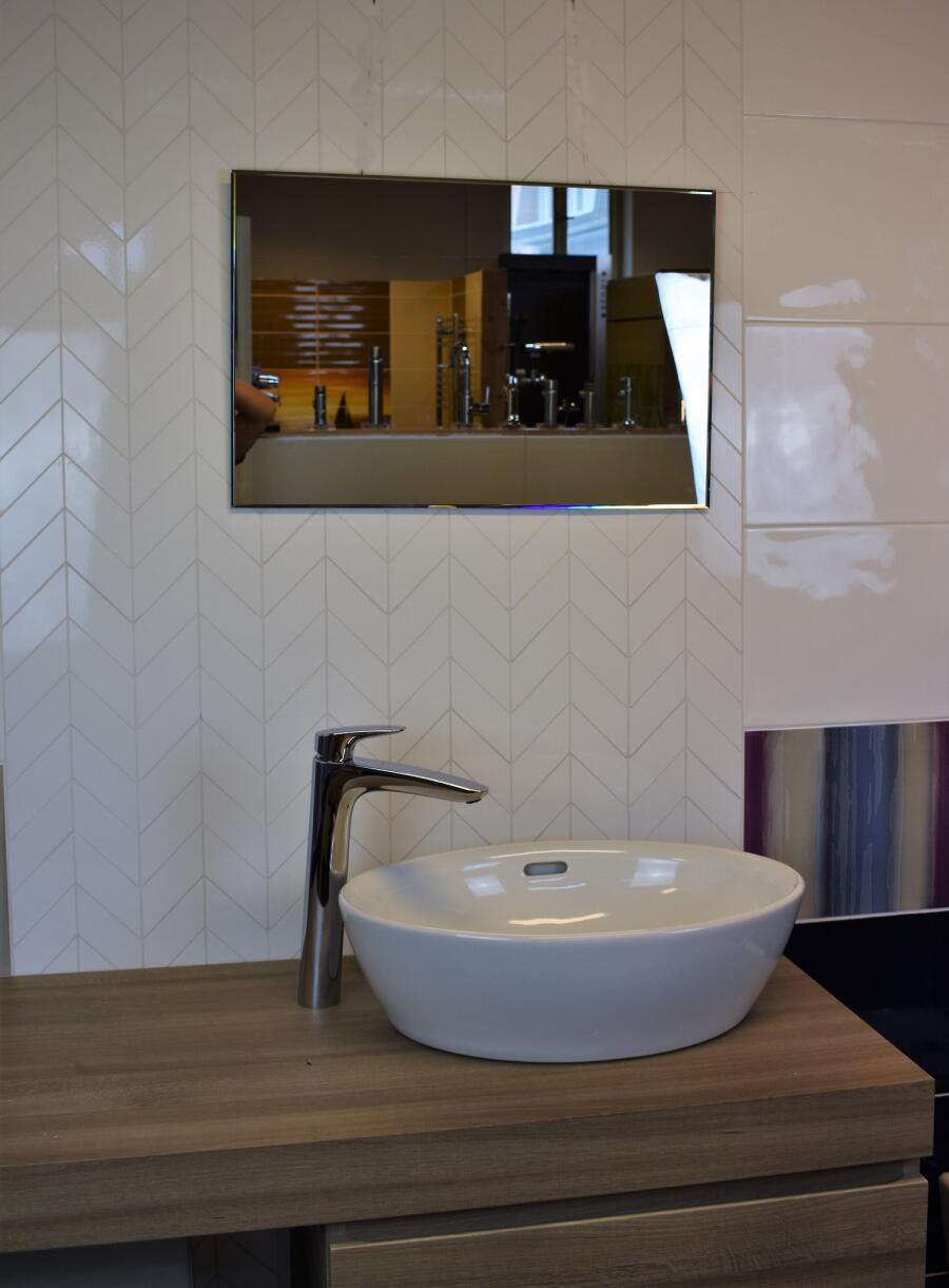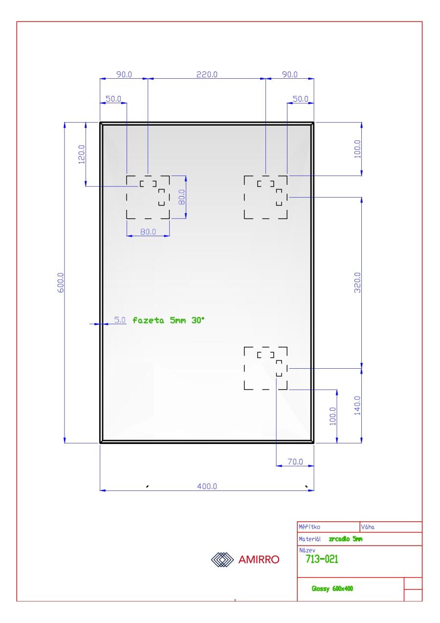 Rozměry: 40 a 60 cm. Lze pověsit na šířku i na výšku. Zrcadla o síle 5 mm s lesklou strmě zkosenou hranou, tzv. strmou fazetou o šířce 5 mm. Zrcadlo je vybavené 3 ks závěsy.