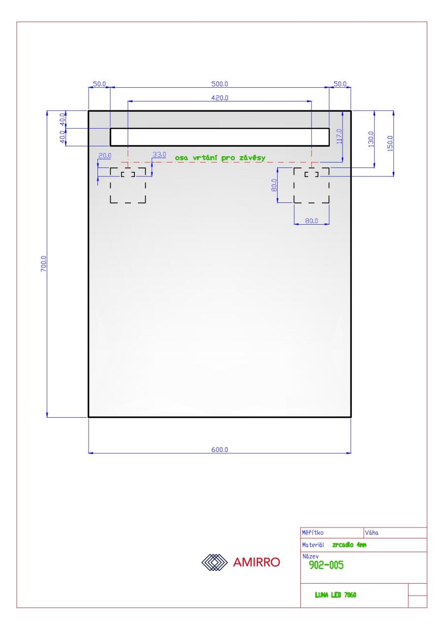 Rozměry: šířka 60 cm a výška 70 cm. Zrcadla Luna LED rozzáří Vaši chodbu, koupelnu či šatnu.Podsvícený pruh má rozměry 50 x 4 cm, což umožňuje komfortní rozptyl světla do popředí. Spotřeba el. energie je 11W. Svítidlo na tomto výrobku obsahuje světelný zdroj s třídou energetické účinnosti G. Splňuje stupeň krytí IP44. Další informace k použitému LED pásku: Barva světla: 4000 °K (neutrální). Zrcadlo je vybaveno 2 ks závěsy (a příslušnými háky do zdi) pro svislé zavěšení a je v provedení s vypínačem. Celková tloušťka zrcadla včetně podsvícení je cca 3,5 cm. Montáž: U zrcadel s osvětlením doporučujeme vývod elektřiny umístit „na střed zrcadla“.
