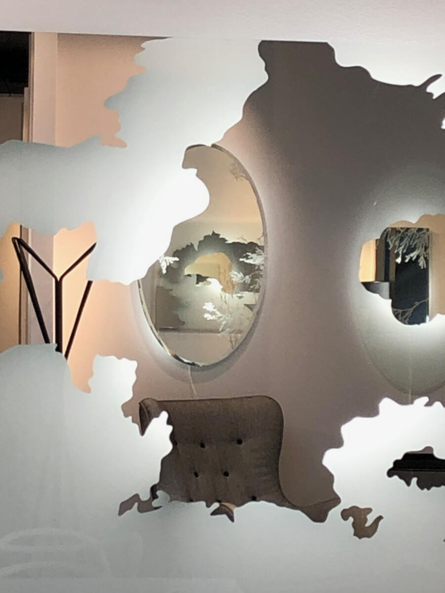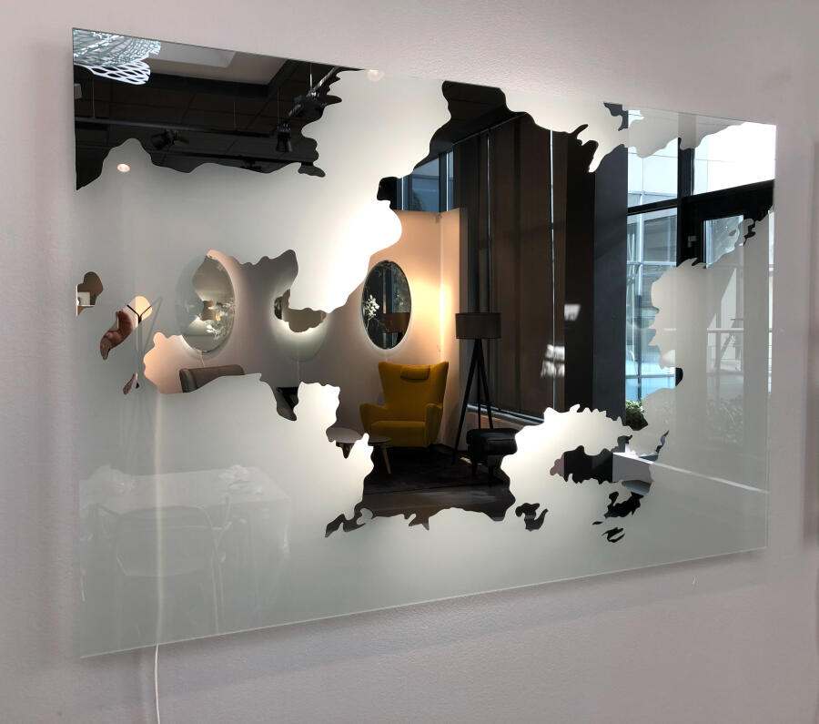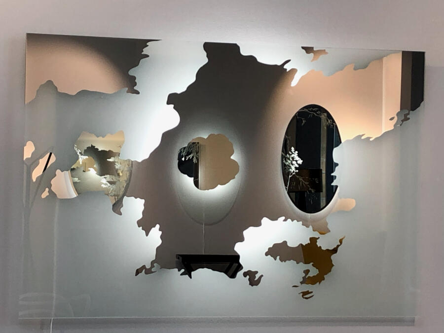 MRAKY I, pískované zrcadlo s podsvícením, 80 x 120 cm