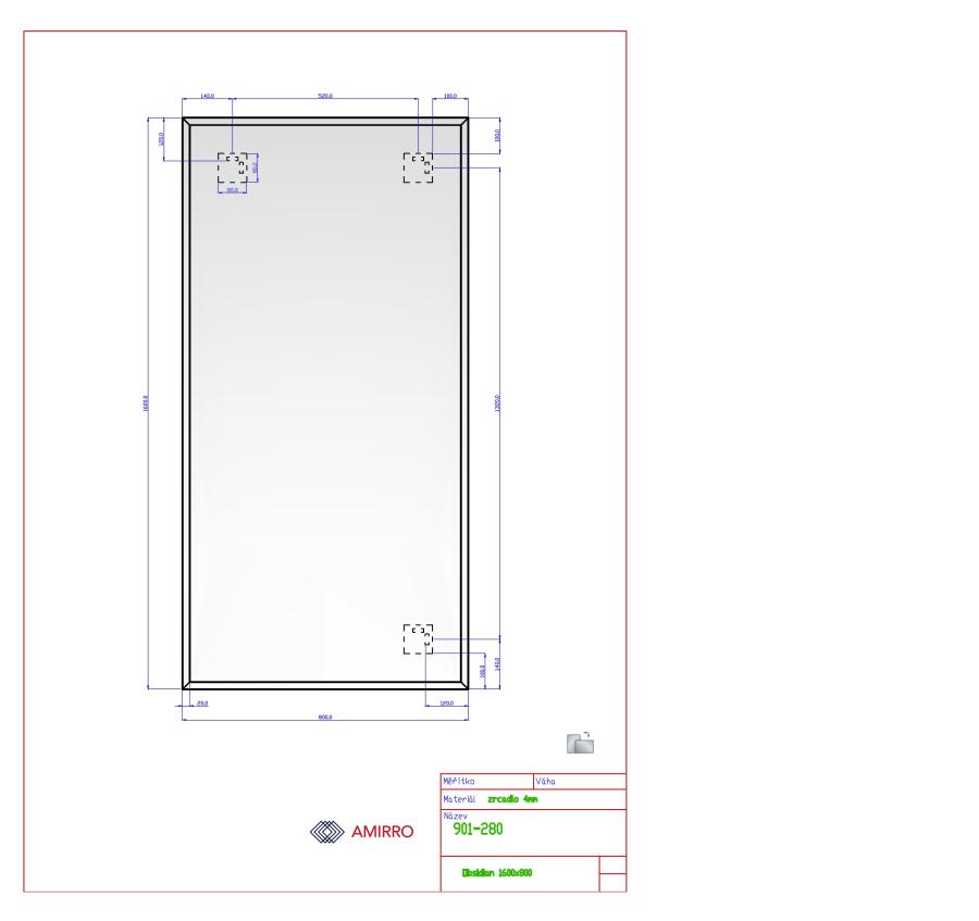 Rozměry: 80 a 160 cm. Zrcadla lemovaná efektní fazetou o šířce 20 mm. Síla zrcadla je 4 mm a je vybaveno 3 ks závěsy pro vodorovné (např. nad dvojumyvadlo) i svislé zavěšení (na chodbu, do šatny).