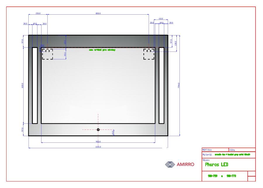 Montáž: Zrcadlo je vybaveno 2 ks závěsy (i vhodné háky na zeď) pro vodorovné zavěšení. U zrcadel s osvětlením doporučujeme vývod elektřiny umístit „na střed zrcadla“.