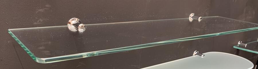 Rozměry: délka 49,8 cm a šířka 12 cm. Poličky z čirého skla o síle 5 mm s leštěnou hranou a jemně zaoblenými předními rohy. Součástí balení jsou dva úchyty k upevnění do zdi včetně hmoždinek.