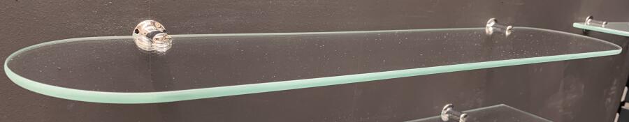 Rozměry: šířka 59 cm a výška 12 cm. Oválné poličky z čirého skla o síle 5 mm s jemně broušenou hranou. Součástí balení jsou dva úchyty k upevnění do zdi včetně hmoždinek.