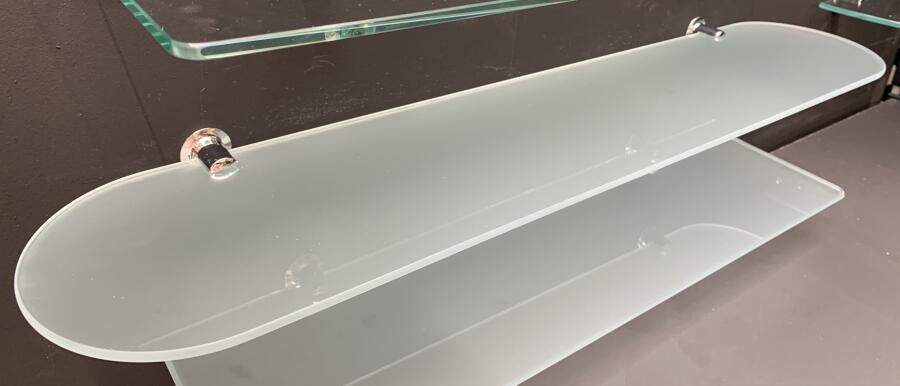 Rozměry: šířka 59 cm a výška 12 cm. Oválné poličky z mléčného skla o síle 5 mm s jemně broušenou hranou. Součástí balení jsou dva úchyty k upevnění do zdi včetně hmoždinek.