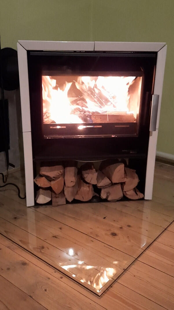 Sklo pod kamna z čirého skla o síle 8 mm ESG, které je částečně lemované fazetou 20 mm. Nosnost na dokonale rovném a neprůhybném podkladu je cca 250 kg