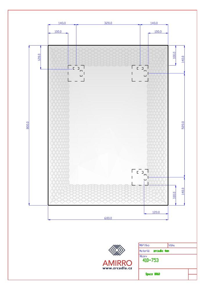 Rozměry: 60 a 80 cm. Lze pověsit na šířku i na výšku. Zrcadla o síle 4 mm s motivem překřížených linií a s leštěnou hranou je vybaveno závěsy a příslušnými montážními prvky na zeď.