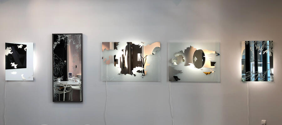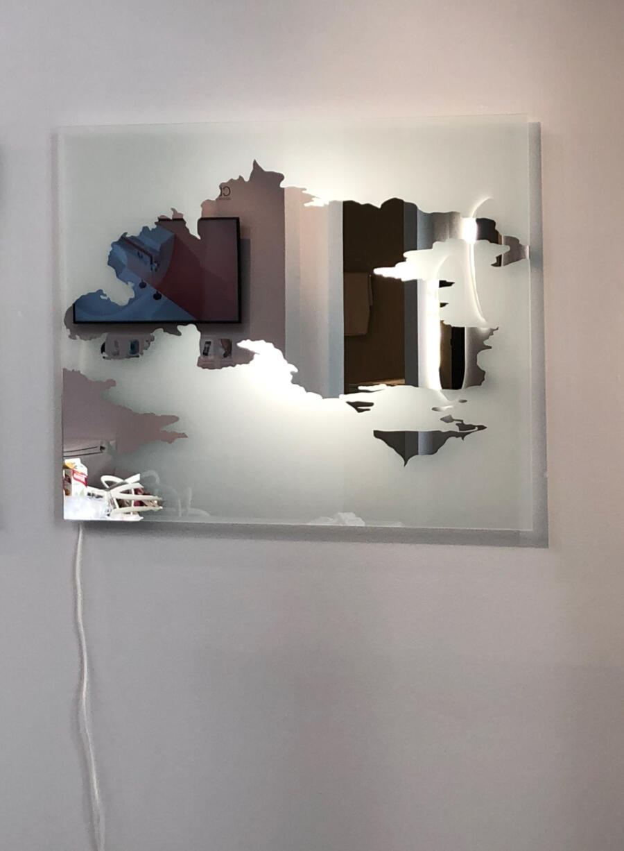 MRAKY II, pískované zrcadlo s podsvícením, 80 x 100 cm
