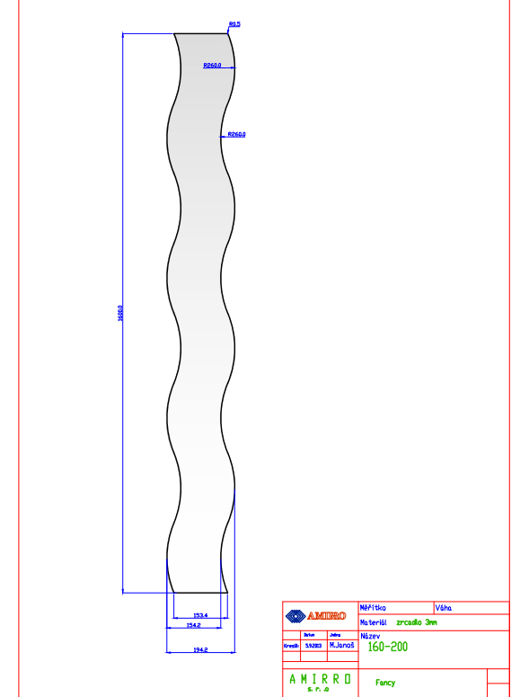 Rozměry: šířka 20 cm a výška 160 cm. Zrcadla o síle 3 mm, 1 vlnka, broušené hrany, včetně závěsu. Uváděný rozměr 20cm je pro šířku opsaného obdélníku, samotné zrcadlo ma šířku vlnky 15cm.