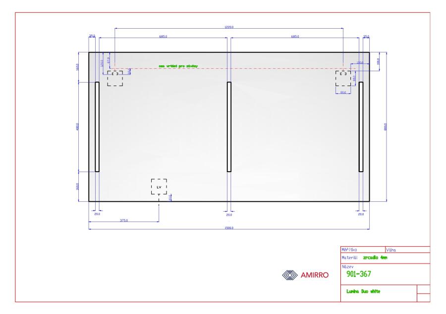 Rozměry: šířka 150 cm a výška 80 cm. Zrcadlo Lumina DUO White se zabudovaným vypínačem je díky třem podsvíceným pruhům osvětlení vhodné nad dvojumyvadlo. Vypínač je skrytý za spodní hranou zrcadla. Podsvícené pruhy mají rozměr 48 x 2 cm a spotřeba el. energie je 33W, 3465 lm.
