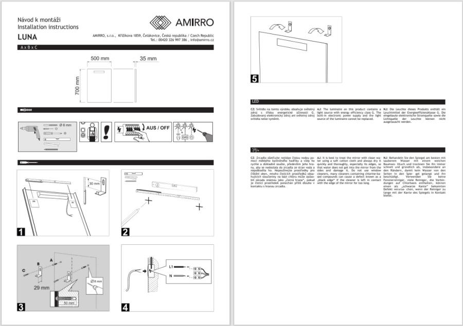 Rozměry: šířka 50 cm a výška 70 cm. Zrcadla Luna rozzáří Váš interiér. Podsvícený pruh má rozměry 23 x 2 cm a spotřeba el. energie integrovaného LED svítidla je 6,5W. Zrcadlo je vybaveno 2 ks úchyty pro svislé zavěšení a je v provedení se stiskacím vypínačem. A rozsvěcí se pomocí zabudovaného mechanického vypínače. Montáž: U zrcadel s osvětlením doporučujeme vývod elektřiny umístit „na střed zrcadla“.