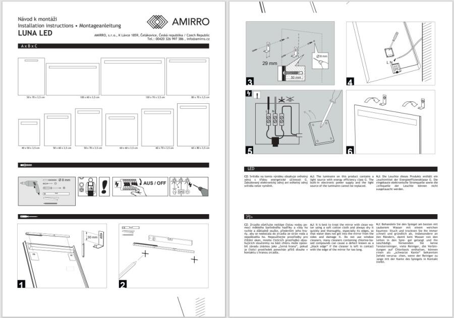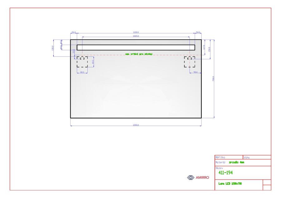 Rozměry: šířka 120 cm a výška 70 cm. Zrcadlo Luna LED rozzáří Vaši chodbu, koupelnu či šatnu.Podsvícený pruh má rozměry 110 x 4 cm, což umožňuje komfortní rozptyl světla do popředí. Spotřeba el. energie je 11W. Svítidlo na tomto výrobku obsahuje světelný zdroj s třídou energetické účinnosti G. Splňuje stupeň krytí IP44. Další informace k použitému LED pásku: Barva světla: 4000 °K (neutrální). Zrcadlo je vybaveno 2 ks závěsy (a příslušnými háky do zdi) pro svislé zavěšení a je v provedení s vypínačem. Celková tloušťka zrcadla včetně podsvícení je cca 3,5 cm. Montáž: U zrcadel s osvětlením doporučujeme vývod elektřiny umístit „na střed zrcadla“.