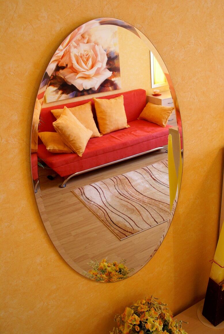 Rozměry: 60 a 100 cm. Lze pověsit na šířku i na výšku. Eliptické zrcadlo s fazetou 20 mm ozdobí každou Vaši místnost. Je vybaveno závěsy. Síla zrcadla je 5mm.