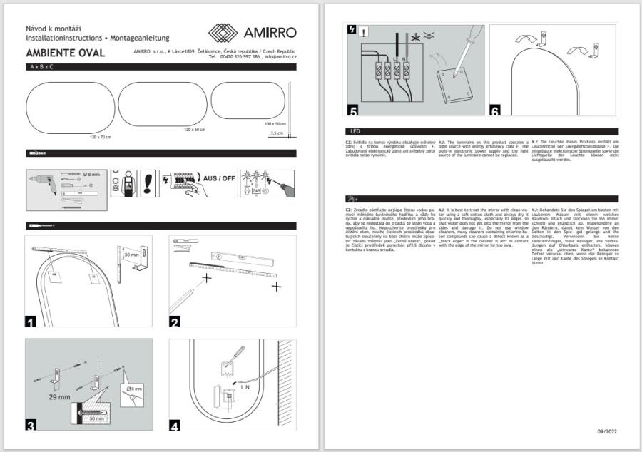 Oválné zrcadlo s příjemným LED podsvícením do stran po celém obvodu. Svítidlo na tomto výrobku obsahuje světelný zdroj s třídou energetické účinnosti F. Splňuje druh ochrany IP44. Další informace k použitému LED pásku: Barva světla: 4000 °K (neutrální). Zrcadlo je vybaveno závěsy (a příslušnými háky na zeď). Je v provedení bez vypínače a rozsvěcí se tedy k tomu určeným vypínačem na zdi. Montáž: U zrcadel s osvětlením doporučujeme vývod elektřiny umístit „na střed zrcadla“.