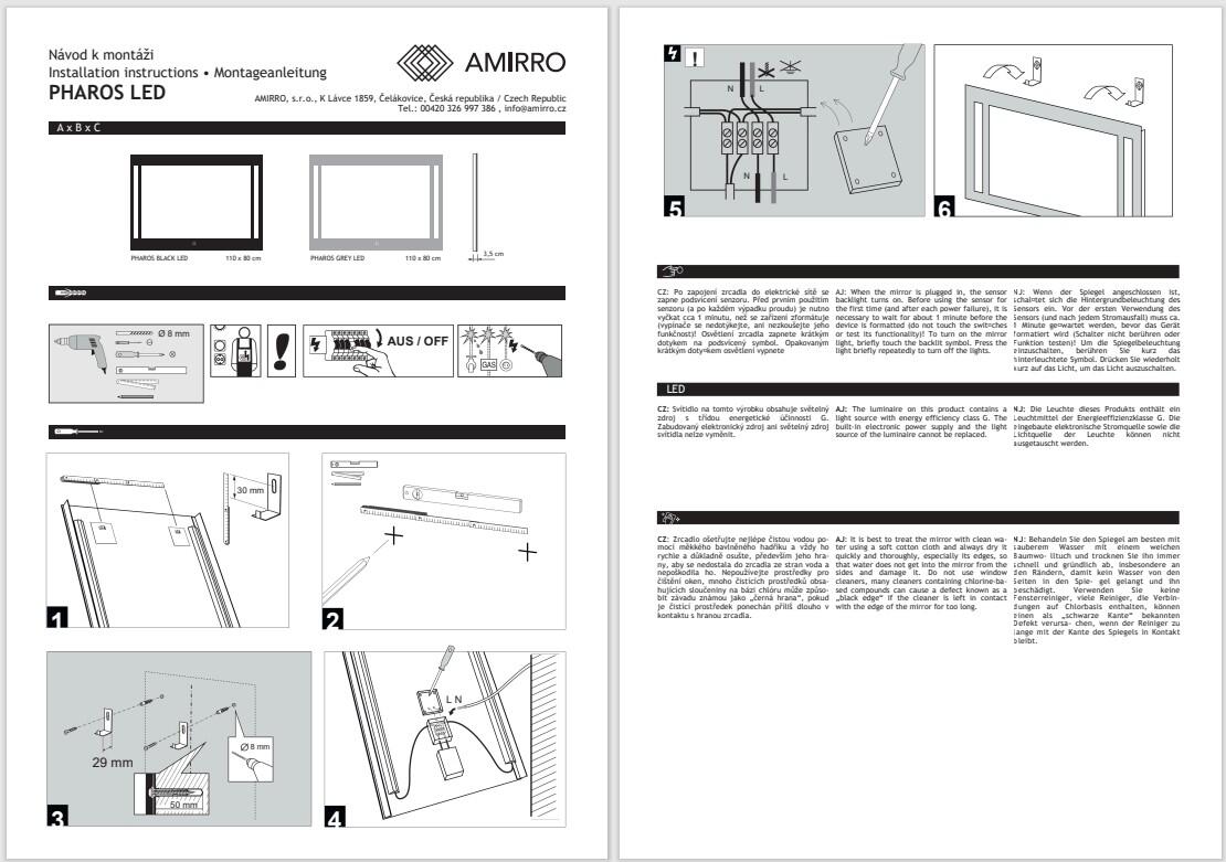 Snadná montáž: Součástí jsou závěsy a příslušný háky na zeď pro vodorovné zavěšení. U zrcadel s osvětlením doporučujeme vývod elektřiny umístit „na střed zrcadla“