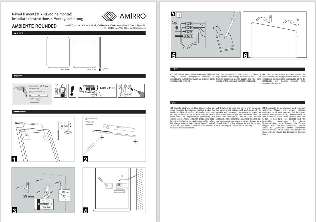 Zrcadlo s trendy zaoblenými rohy a s příjemným LED podsvícením do stran po celém obvodu je vybaveno závěsy i vhodnými háky na zeď. Lze pověsit na šířku i na výšku. Svítidlo na tomto výrobku obsahuje světelný zdroj s třídou energetické účinnosti F. Splňuje druh ochrany IP44. Další informace k použitému LED pásku: Barva světla: 4000 °K (neutrální), Svítivost: 3120 lm. Zrcadlo je v provedení bez vypínače a rozsvěcí se tedy k tomu určeným vypínačem na zdi. Celková tloušťka zrcadla včetně podsvícení je cca 3,5 cm. U zrcadel s osvětlením doporučujeme vývod elektřiny umístit „na střed zrcadla“.