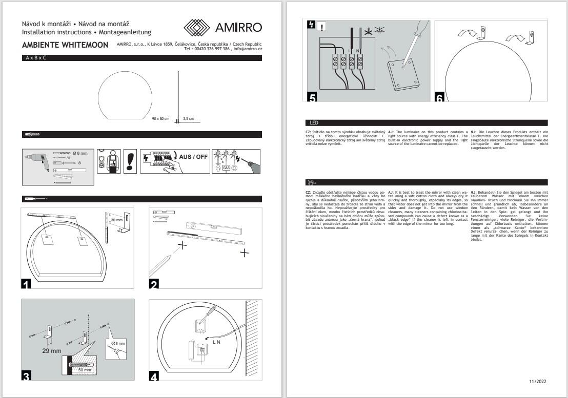 Rozměry: 90 x 80 cm (šířka x výška). Zrcadlo v novém designu ve tvaru kruhová úseč s příjemným LED podsvícením do stran dodá vaší koupelně ten správný šarm. Svítidlo na tomto výrobku obsahuje světelný zdroj s třídou energetické účinnosti F. Splňuje druh ochrany IP44 a je v provedení bez vypínače a rozsvěcí se tedy pomocí k tomu určenému vypínači na zdi. Spotřeba el. energie je 21 W. Další informace k použitému LED pásku: Barva světla: 4000 °K (neutrální), Svítivost: 2730 lm. Zrcadlo je vybaveno závěsy i vhodnými montážními prvky na zeď. Celková tloušťka zrcadla včetně podsvícení je cca 3,5 cm. U zrcadel s osvětlením doporučujeme vývod elektřiny umístit „na střed zrcadla“.