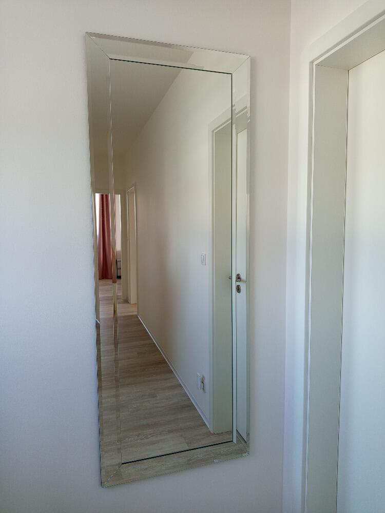 Rozměry: 60 a 160 cm. Lze pověsit na šířku i na výšku. Zrcadla o síle 5 mm zdobené efektními 7,5 cm širokými fazetovanými lištami (šířka fazety je 15 mm) dodáváme včetně 3 závěsů.