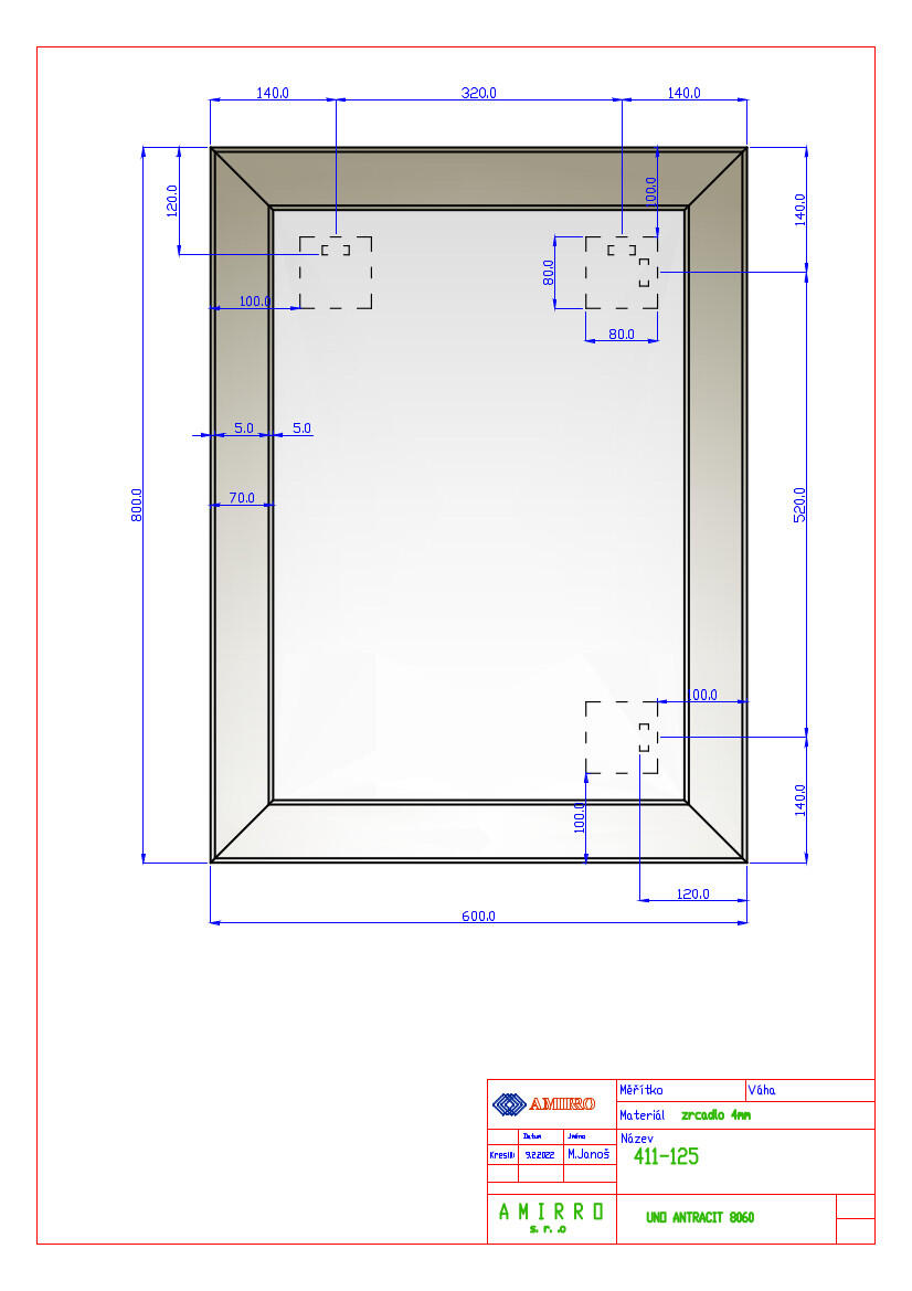 Rozměry: 60 a 80 cm. Lze pověsit na šířku i na výšku. Zrcadla zdobené matnými fazetovanými (decentní strmá fazeta) 7 cm širokými lištami tzv. matelac v odstínu černá antracit je vhodným designovým dopňkem k oblíbeným černým koupelnovým doplňkům. Zrcadlo je vybavené závěsy a příslušnými montážními prvky na zeď. Výrobu zrcadla nabízíme i v atypických rozměrech dle přání zákazníka.