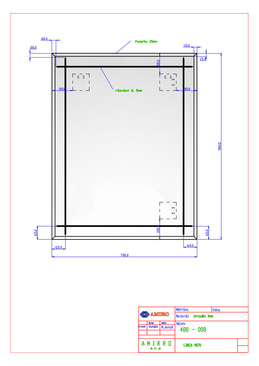 Rozměry: 70 a 90 cm. Lze pověsit na šířku i na výšku. Fazetovaná zrcadla o síle 4 mm zdobené gravírovaným vzorem. Šířka fazety je 15 mm, gravírovaný vzor se nachází 6,5 cm od okraje a je široký 5 mm. Dodáváme včetně 3 závěsů. Rilování (gravírování) - vybroušená rýha (drážka) na skle nebo zrcadle, může být různého profilu, šířky, může být jenom broušená anebo i leštěná. Pomocí této „rily“ se dají vykreslit na skle různé obrazce.