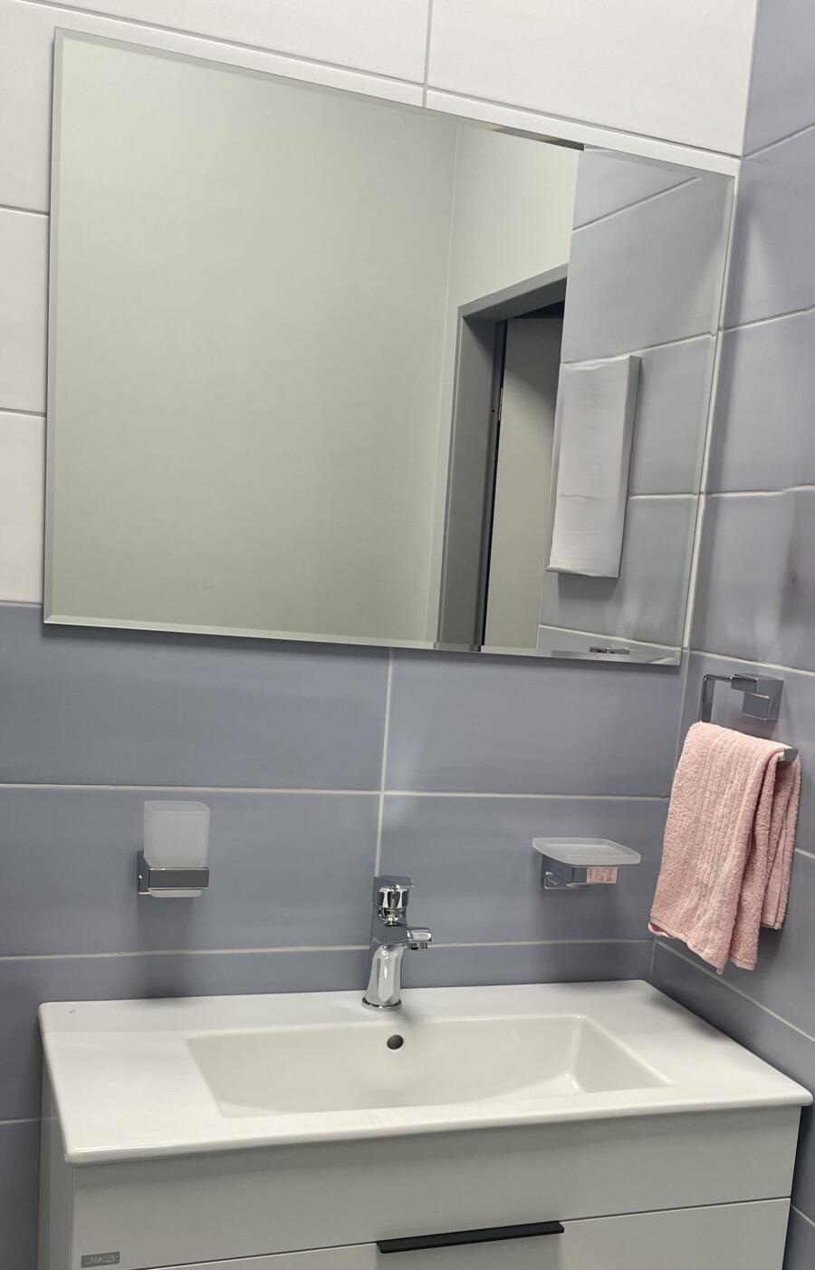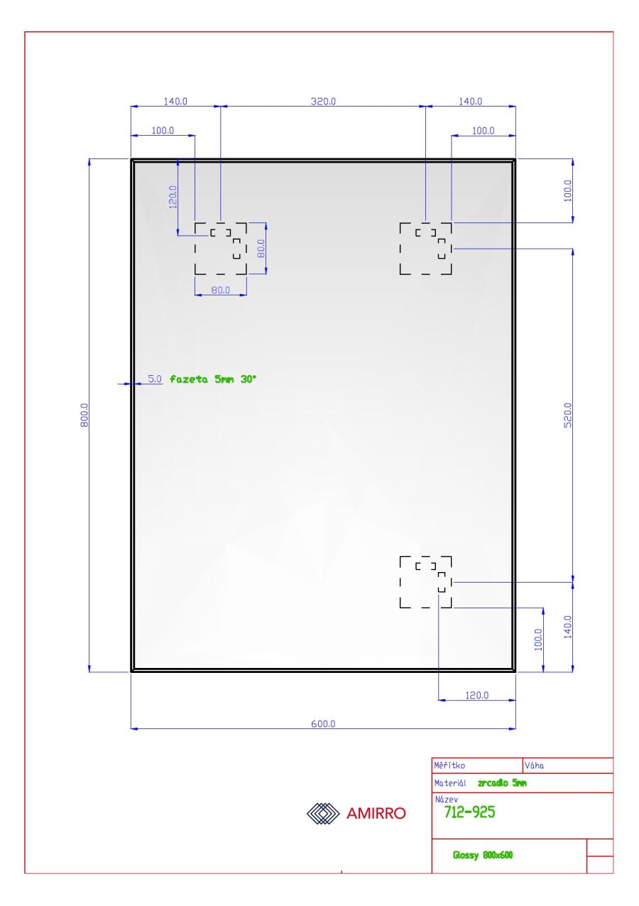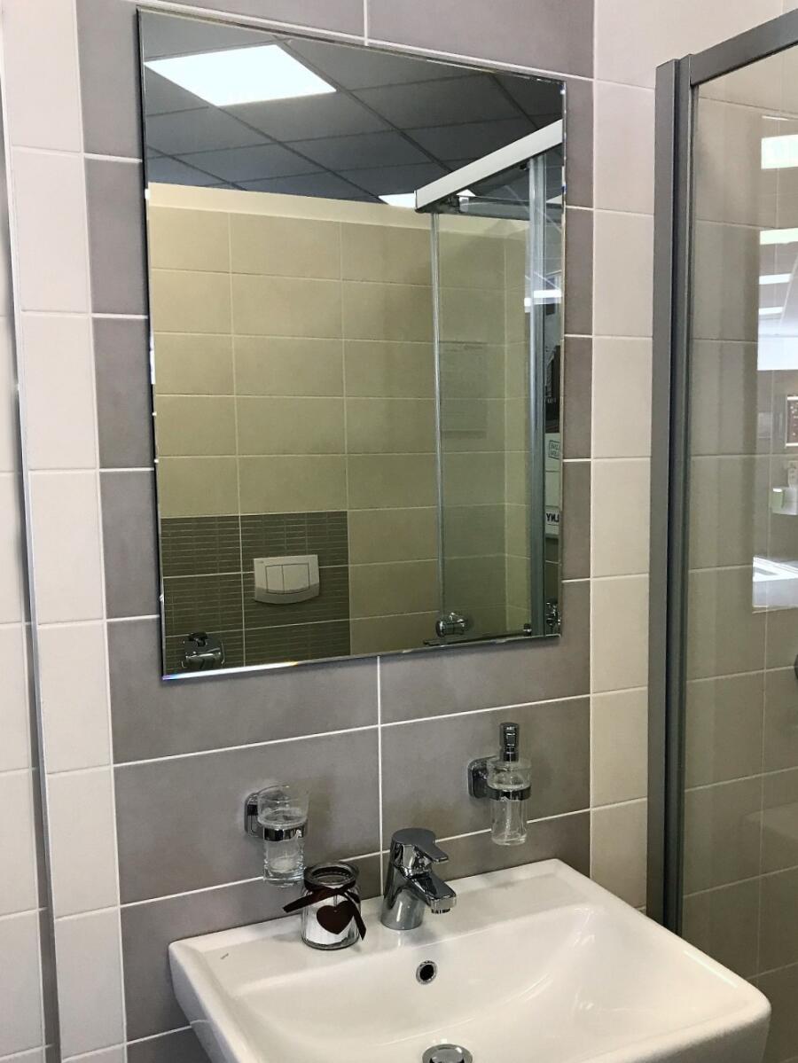 Rozměry: 60 a 80 cm. Lze pověsit na šířku i na výšku. Zrcadla o síle 5 mm s lesklou strmě zkosenou hranou, tzv. strmou fazetou o šířce 5 mm. Zrcadlo je vybavené 3 ks závěsy.