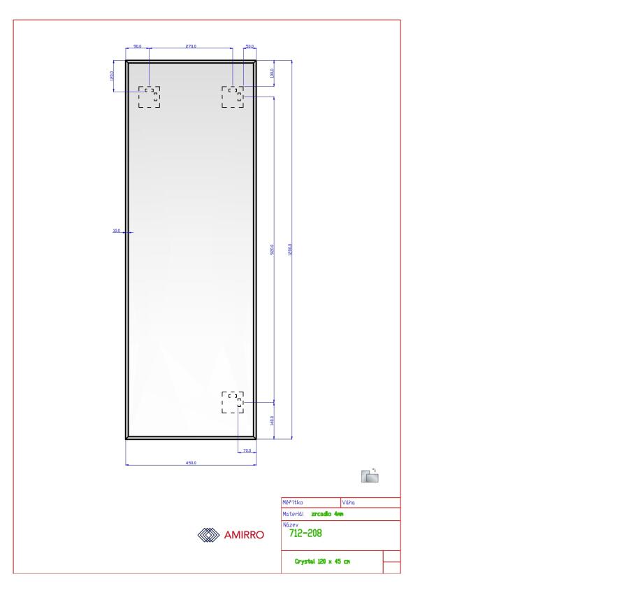 Rozměry: 45 a 120 cm. Lze pověsit na šířku i na výšku. Jednoduchá zrcadla s fazetou 10 mm. Síla zrcadla je 4 mm a je vybaveno 3 ks závěsy. Fazeta – obroušením a vyleštěním okraje zrcadla šikmo pod úhlem 4 – 20° v šířce 5 - 30 mm se vytvoří změnou úhlu odrazu optický efekt rámečku.
