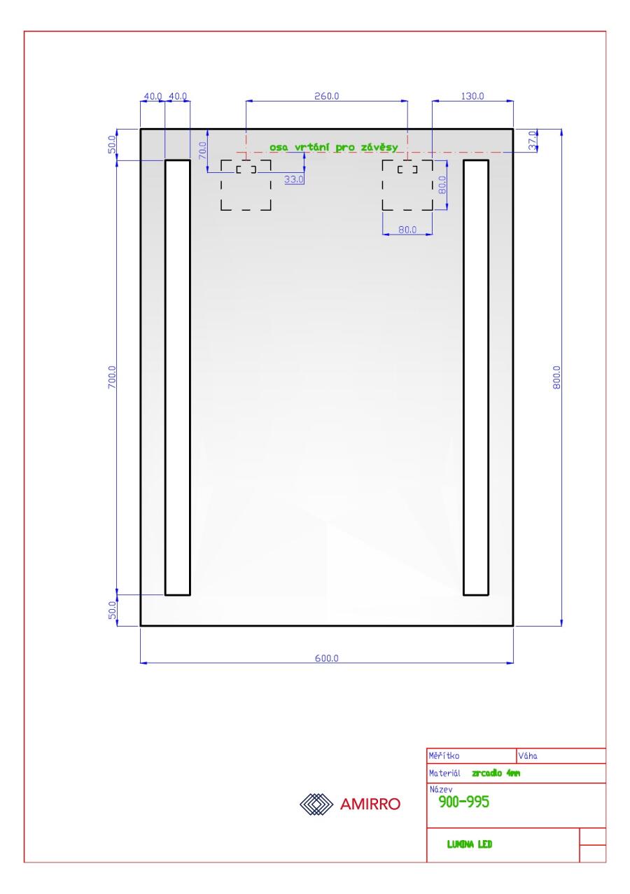 Rozměry: šířka 60 cm a výška 80 cm. Podsvícené pruhy mají rozměr 60 x 4 cm a spotřeba el. energie je 30W, 3150 lm. Další informace k použitému LED pásku: Barva světla: 4000 °K (neutrální). Zrcadlo je v provedení bez vypínače tj. rozsvěcí se příslušným vypínačem na zdi a je vybaveno úchyty (závěsy i vhodné háky na zeď) pro svislé zavěšení a splňuje stupeň krytí IP44. Celková tloušťka zrcadla včetně podsvícení je cca 4 cm. U zrcadel s osvětlením doporučujeme vývod elektřiny umístit „na střed zrcadla“.