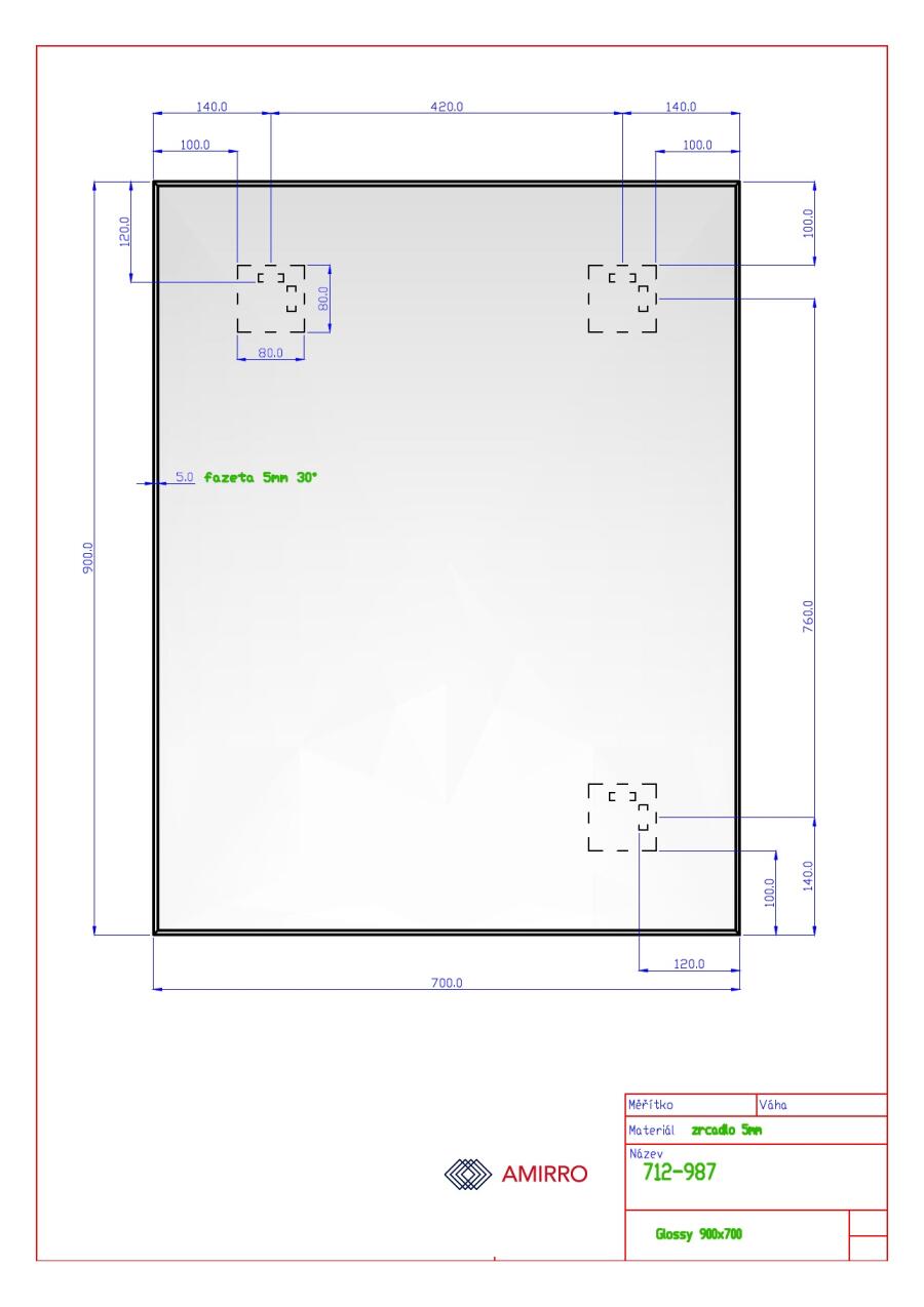 Rozměry: 70 a 90 cm. Lze pověsit na šířku i na výšku. Zrcadla o síle 5 mm s lesklou strmě zkosenou hranou, tzv. strmou fazetou o šířce 5 mm. Zrcadlo je vybavené 3 ks závěsy.