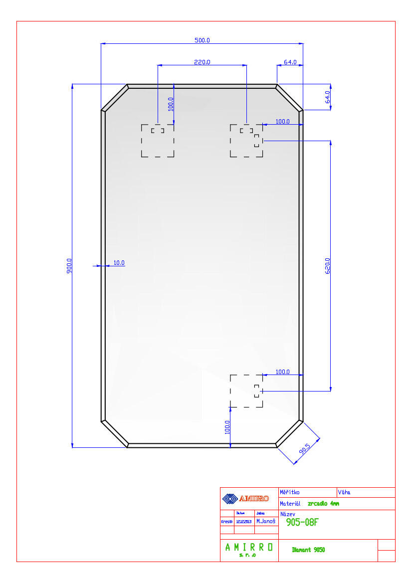 Rozměry: 50 a 90 cm. Lze pověsit na šířku i na výšku. Zrcadla o síle 3 mm, osmihran s fazetou 10 mm, je vybaveno 3 ks závěsy.