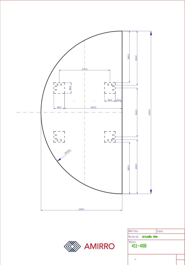 Rozměry: 120 cm a 60 cm. Díky 4 závěsům lze pověsit třemi směry - svisle a vertikálně napravo i nalevo. Nevšední zrcadlo půlkruhového tvaru o síle 4mm s leštěnou hranou - včetně závěsů.