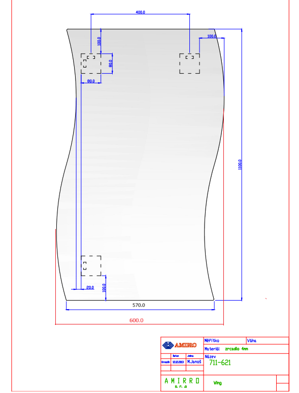 Rozměry: 60 a 110 cm. Lze pověsit na šířku i na výšku. Zrcadla o síle 4 mm, vlnka, s fazetou 10mm na krátkých hranách, včetně závěsů. Uváděný rozměr 60 cm je pro šířku opsaného obdélníku, samotné zrcadlo na šířku vlnky má 57 cm.