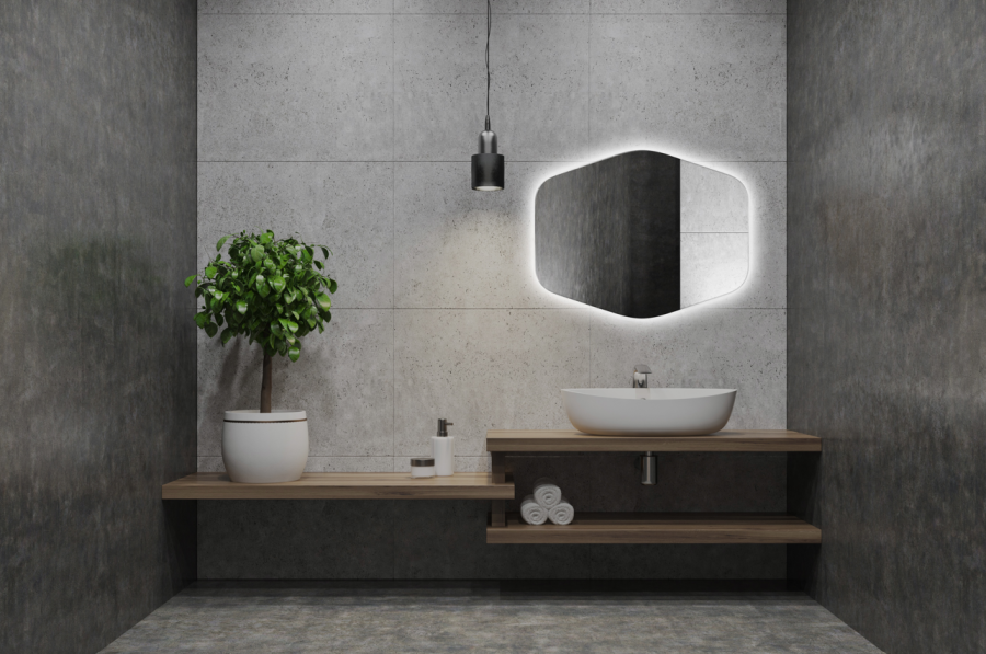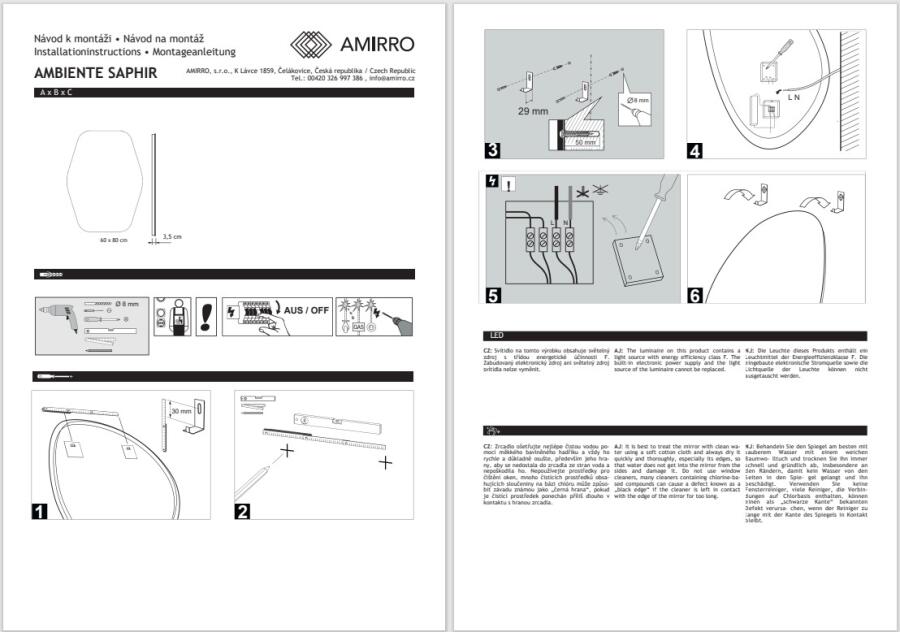 Zrcadlo je v provedení bez vypínače a rozsvěcí se tedy k tomu určeným vypínačem na zdi. Montáž: U zrcadel s osvětlením doporučujeme vývod elektřiny umístit „na střed zrcadla“.