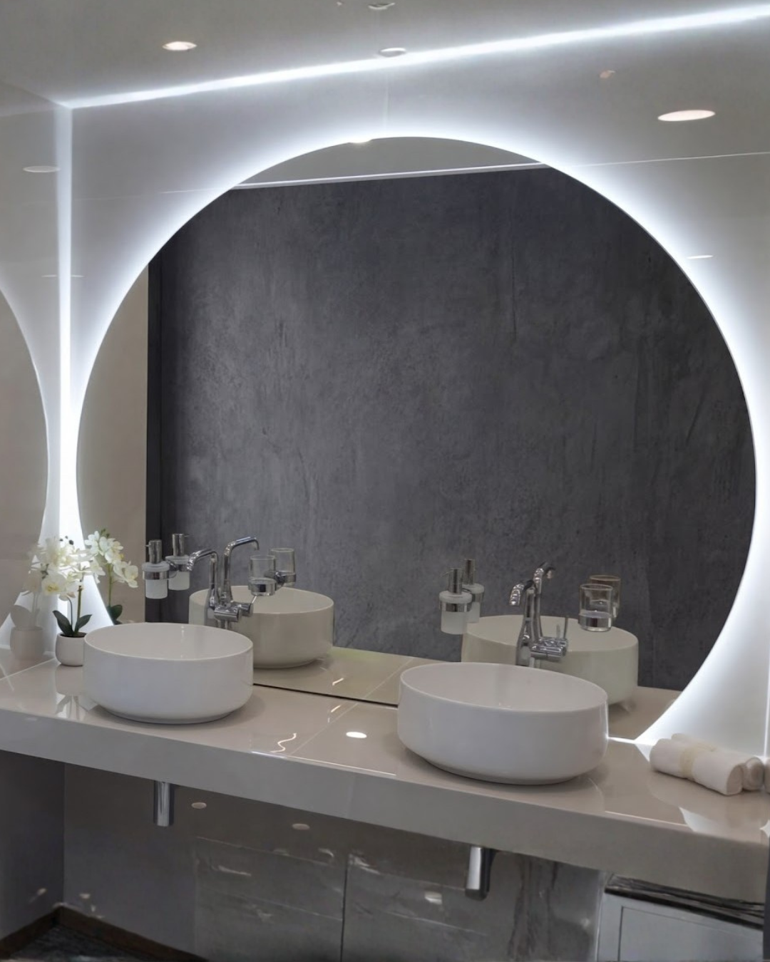 Zrcadlo v designovém tvaru kruhová úseč s příjemným LED podsvícením do stran