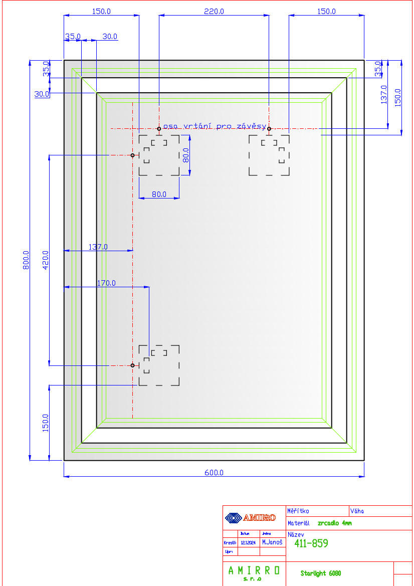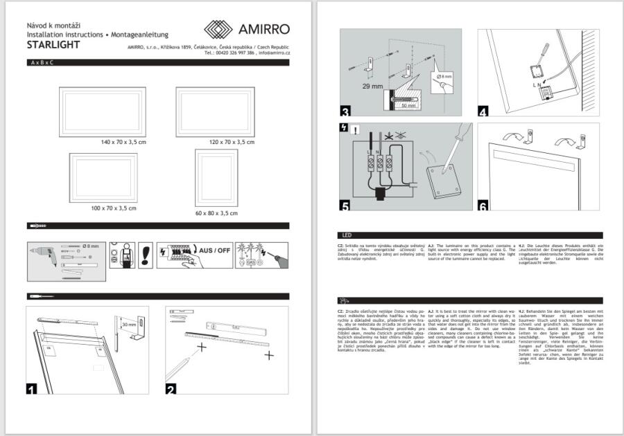 Rozměry: 60 x 80 cm. Lze pověsit na šířku i na výšku. Zrcadlo s předním LED podsvícením. Podsvícené pruhy vynikají obzvláště velikou svítivostí, zdroj světla je totiž nasměrován přímo na Vás a jsou tak ideálním pomocníkem při líčení či holení. Zrcadlo je vybaveno závěsy i vhodnými háky na zeď. Svítidlo na tomto výrobku obsahuje světelný zdroj s třídou energetické účinnosti G. Splňuje druh ochrany IP44. Spotřeba el. energie je 22 W. Další informace k použitému LED pásku: Barva světla: 4000 K, Svítivost: 2860 lm. Zrcadlo je v provedení bez vypínače a rozsvěcí se tedy k tomu určeným vypínačem na zdi. U zrcadel s osvětlením doporučujeme vývod elektřiny umístit „na střed zrcadla“.