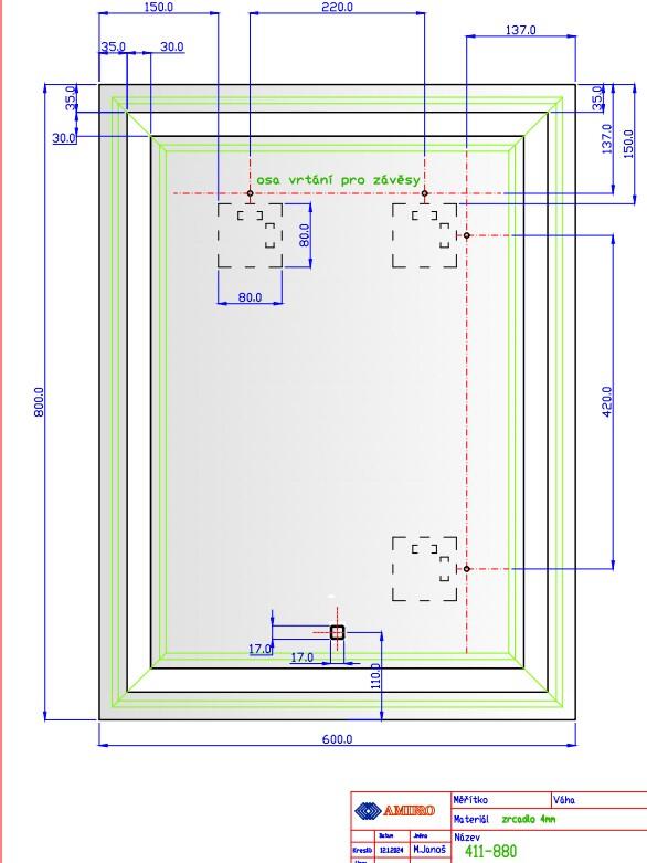 Technické specifikace: Splňuje stupeň krytí IP44, spotřeba el. energie je max. 20 WMontáž: Zrcadlo je vybaveno závěsy a příslušnými montážními prvky na zeď. U zrcadel s osvětlením doporučujeme vývod elektřiny umístit „na střed zrcadla“.