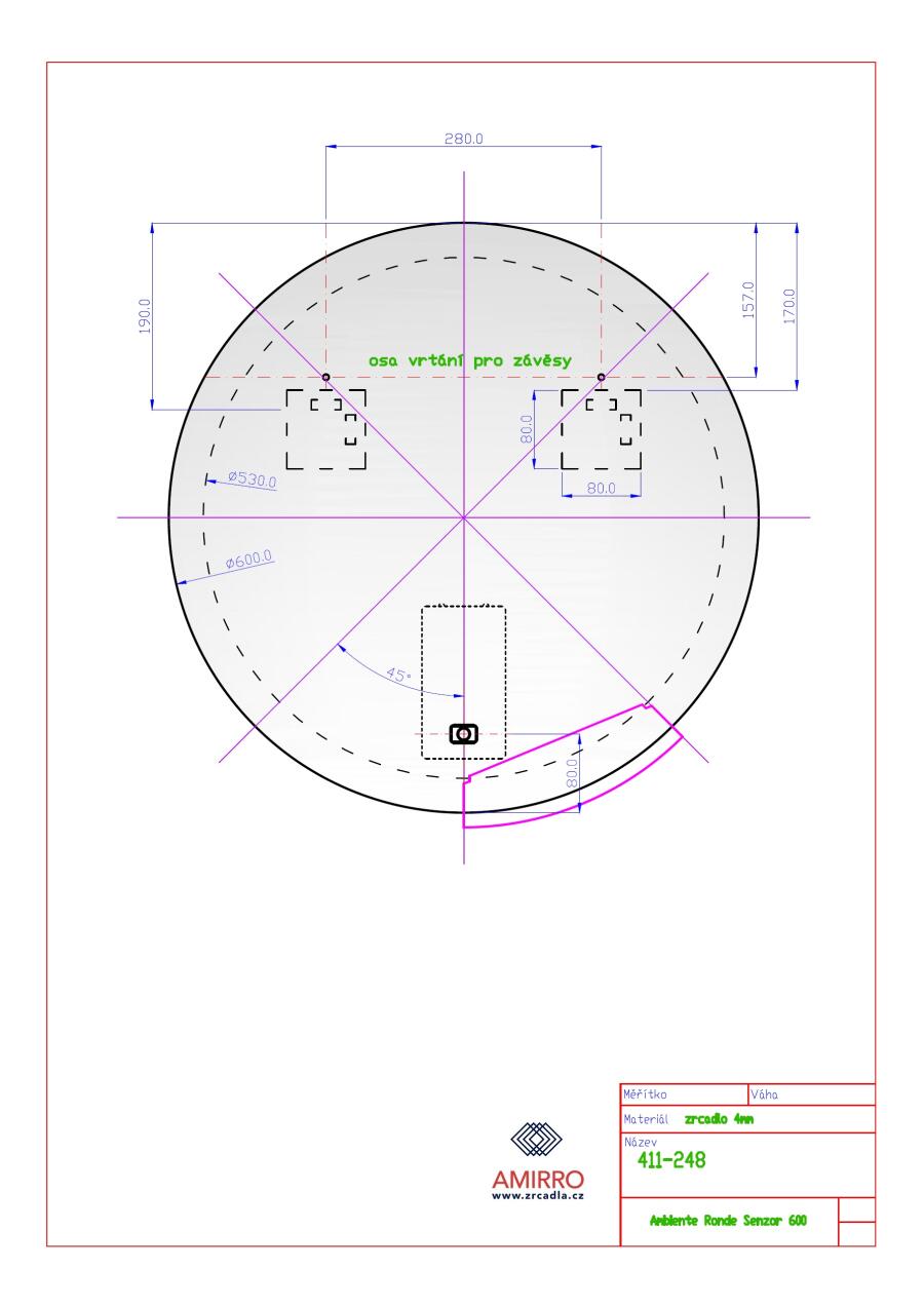 Montáž: Zrcadlo je vybaveno závěsy i vhodnými háky na zeď. U zrcadel s osvětlením doporučujeme vývod elektřiny umístit „na střed zrcadla“.