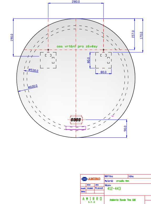 Celková tloušťka zrcadla včetně podsvícení je cca 3,5 cm. U zrcadel s osvětlením doporučujeme vývod elektřiny umístit „na střed zrcadla“.