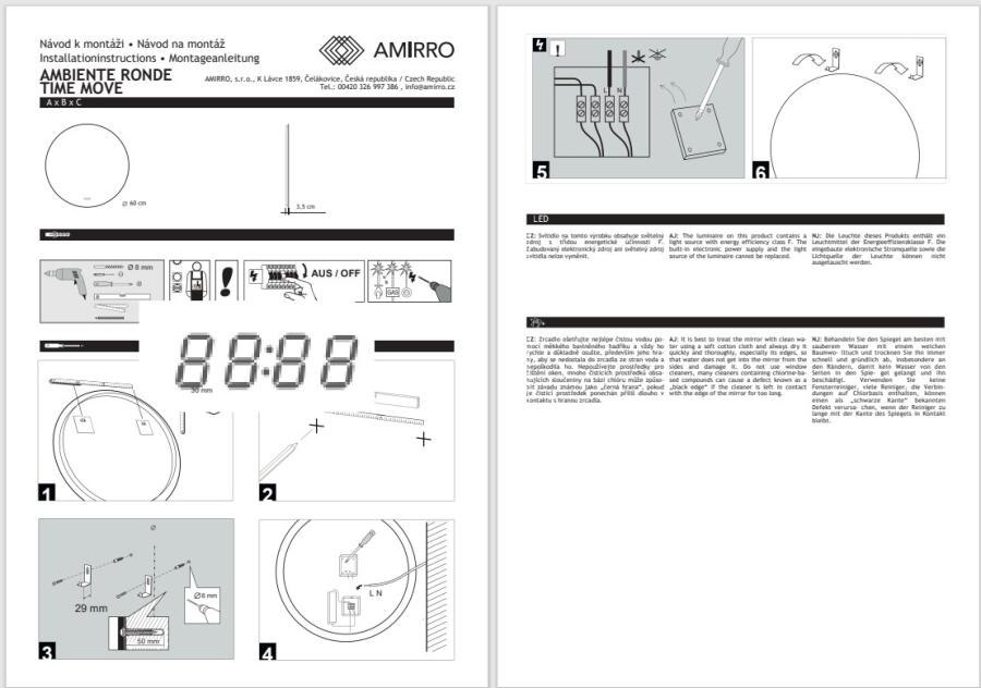 I když senzorem vypnete osvětlení zrcadla, hodiny zůstávají pod proudem a fungují. V případě, že je zrcadlo napojeno současně i na vypínač na zdi, i tento musí být v poloze zapnuto, aby hodiny fungovaly. Zrcadlo je vybaveno závěsy i vhodnými háky na zeď.