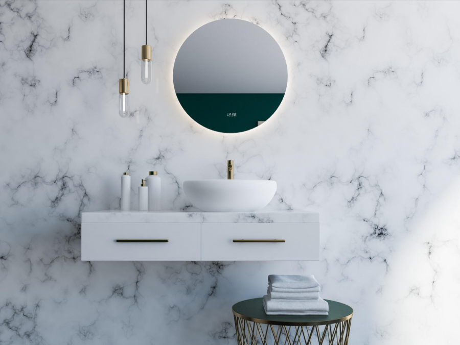 Kruhové zrcadlo o průměru 60 cm s LED podsvícením po celém obvodu a s hodinami