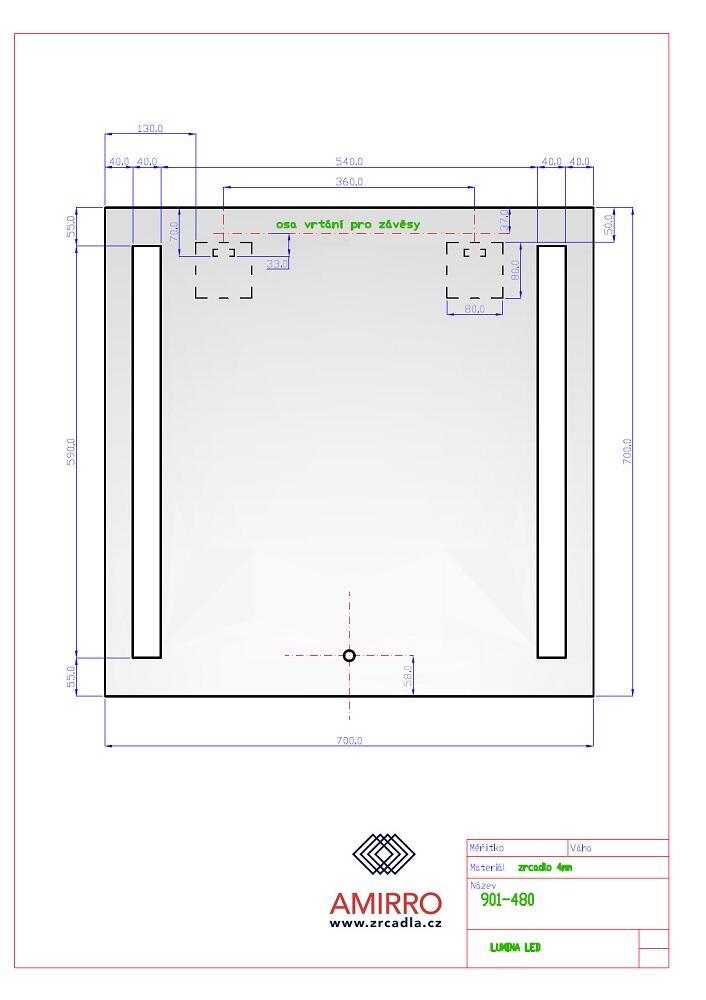 Rozměry: šířka 70 cm a výška 70 cm. Podsvícené pruhy mají rozměr 60 x 4 cm a spotřeba el. energie je max. 2 x 9 W. Další informace k použitému LED pásku: Barva světla: 4000 °K (neutrální) Zrcadlo se rozsvěcí dotykovým sensorem. Senzor je jemně podsvícený, najdete jej snadno i v naprosté tmě. Zrcadlo je vybaveno úchyty (závěsy i vhodné háky na zeď) pro zavěšení a splňuje druh ochrany IP44. Celková tloušťka zrcadla včetně podsvícení je cca 4 cm. Montáž: U zrcadel s osvětlením doporučujeme vývod elektřiny umístit „na střed zrcadla“.